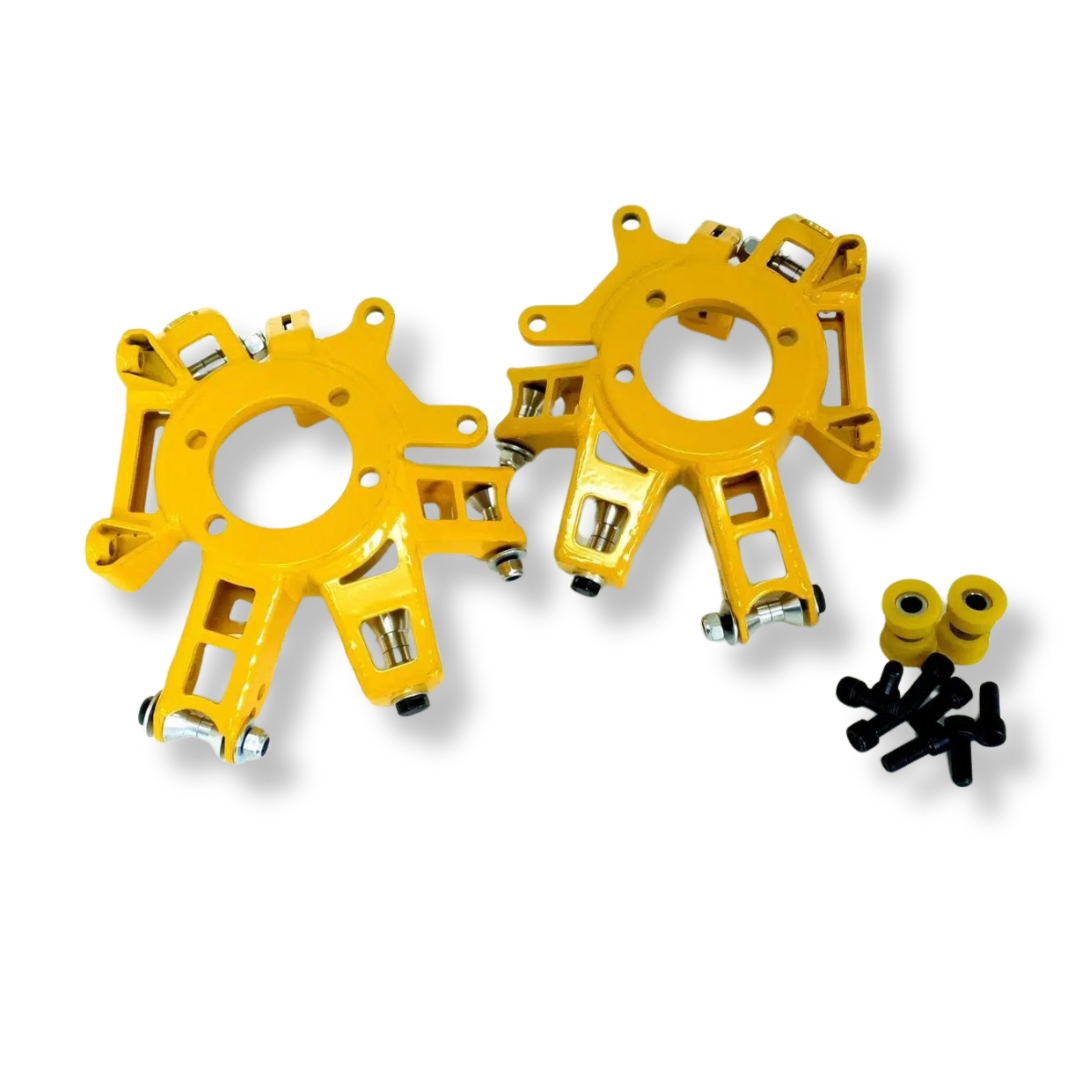 Uchwyty hamulców są wykonane pod 1 seryjny zacisk na każdą stronę, a drugi uchwyt jest uniwersalny, do niektórych adapterów hamulcowych i różnych zacisków niestandardowych.